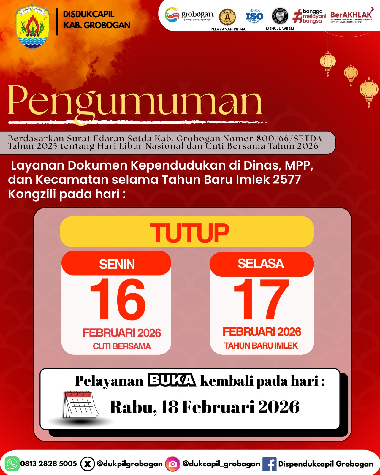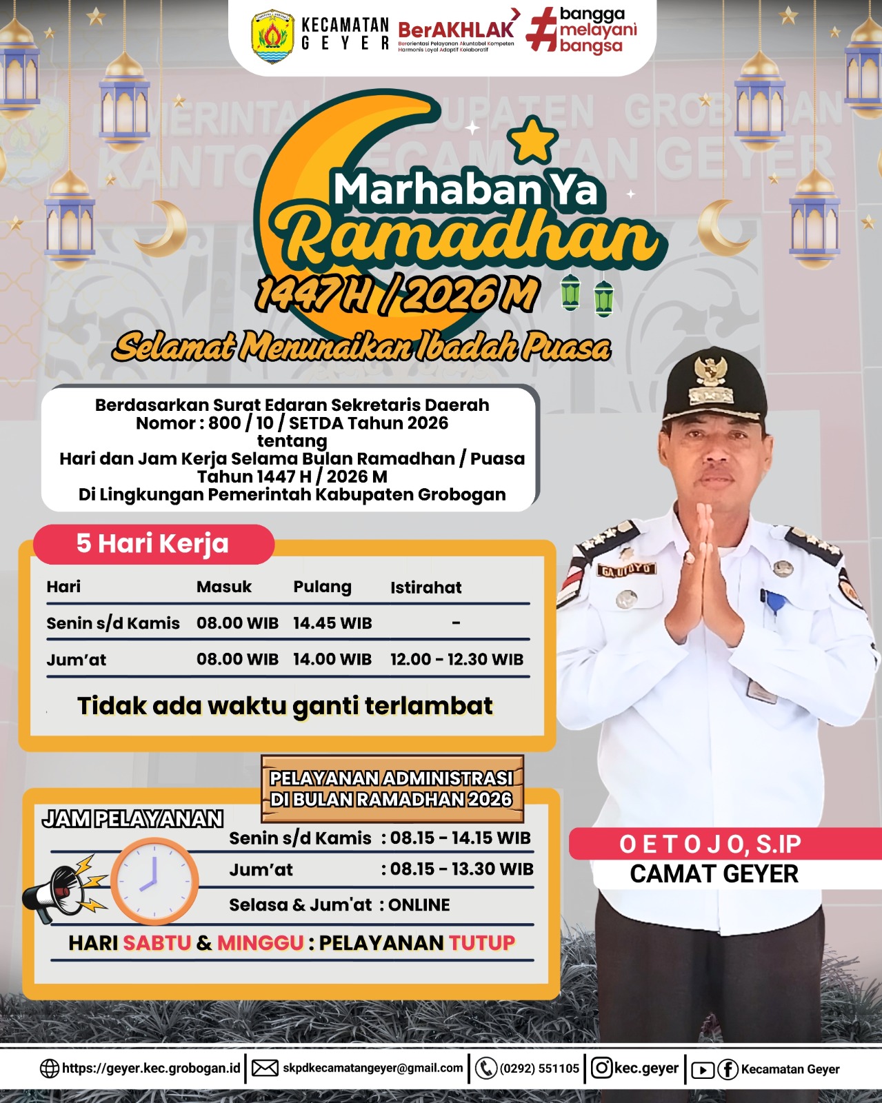 Kami beritahukan kepada seluruh masyarakat khususnya wilayah Kecamatan Geyer bahwa selama bulan Ramadhan 1447 H / 2026 maka kami sampaikan perubahan jam pelayanan. Khusus untuk pelayanan adminitrasi kependudukan hari Selasa dan Jum'at dilaksanakan secara online. Demikian harap menjadikan maklum. Terima kasih